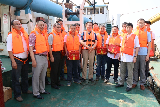 時(shí)值“三伏”盛夏、酷暑難耐,7月27日上午建工集團(tuán)總經(jīng)理劉家靜、工會(huì)主席徐曉光等一行頂著炎炎烈日、不辭辛勞,來到正在青弋江河道中進(jìn)行河道清淤的“蛟龍?zhí)枴蓖谀啻希瑸檎诖鲜┕ぷ鳂I(yè)的船員們帶來關(guān)懷關(guān)愛、送來防暑降溫物品。集團(tuán)公司總經(jīng)理助理、工程管理部主任童宗勝,集團(tuán)工會(huì)副主席吳曉伍,安徽交航董事長(zhǎng)、黨委書記、總經(jīng)理李世龍等陪同慰問。