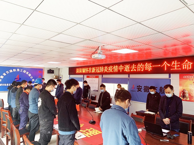 伴隨著警報聲和汽笛聲,在這個特殊的日子,為深切哀悼抗擊新冠疫情中犧牲的烈士和逝世的同胞,安徽交航合軌4號線TJ03標(biāo)項目部降半旗,全體工作人員在十點整默哀三分鐘,致敬英雄,緬懷逝者。