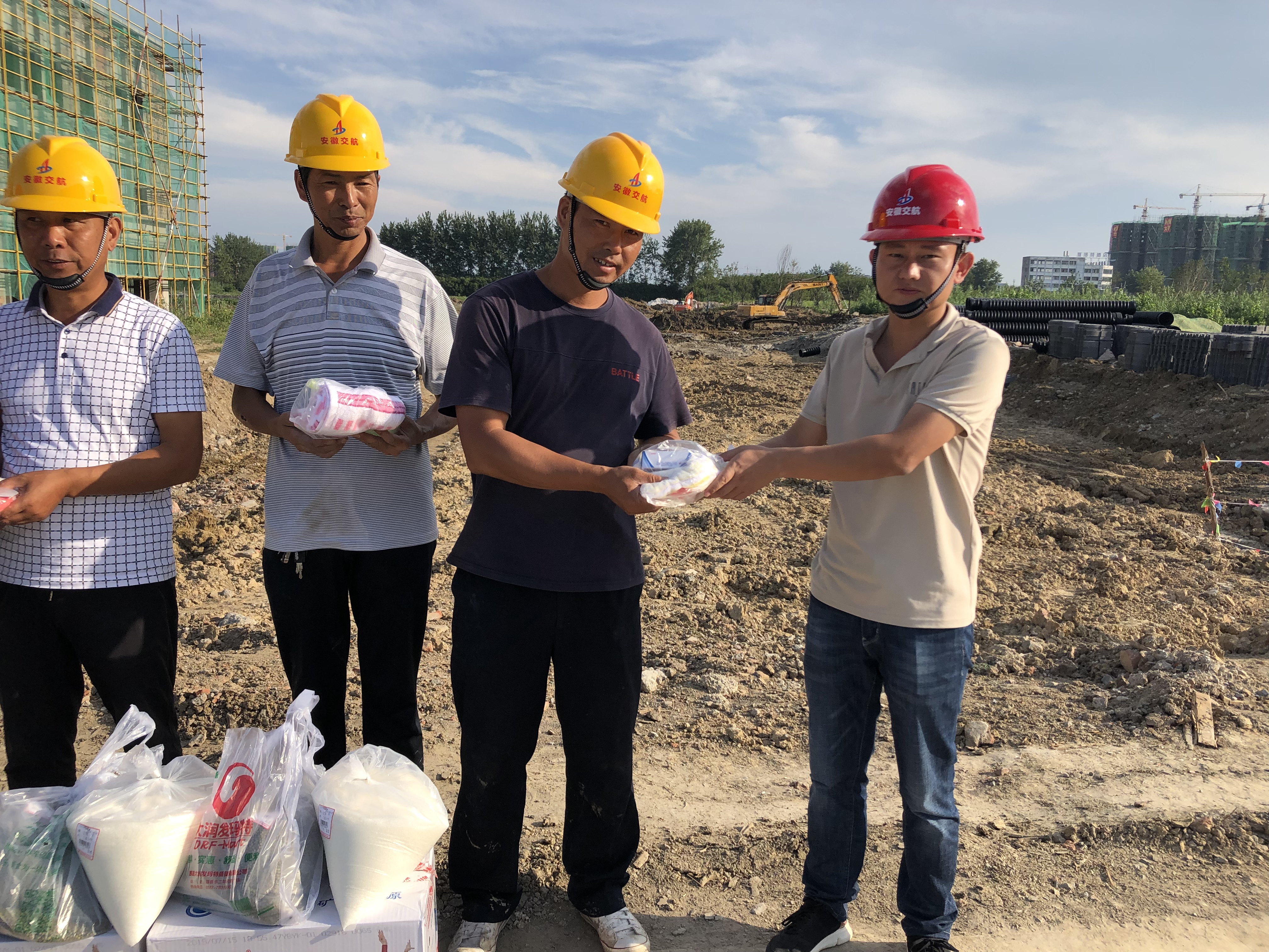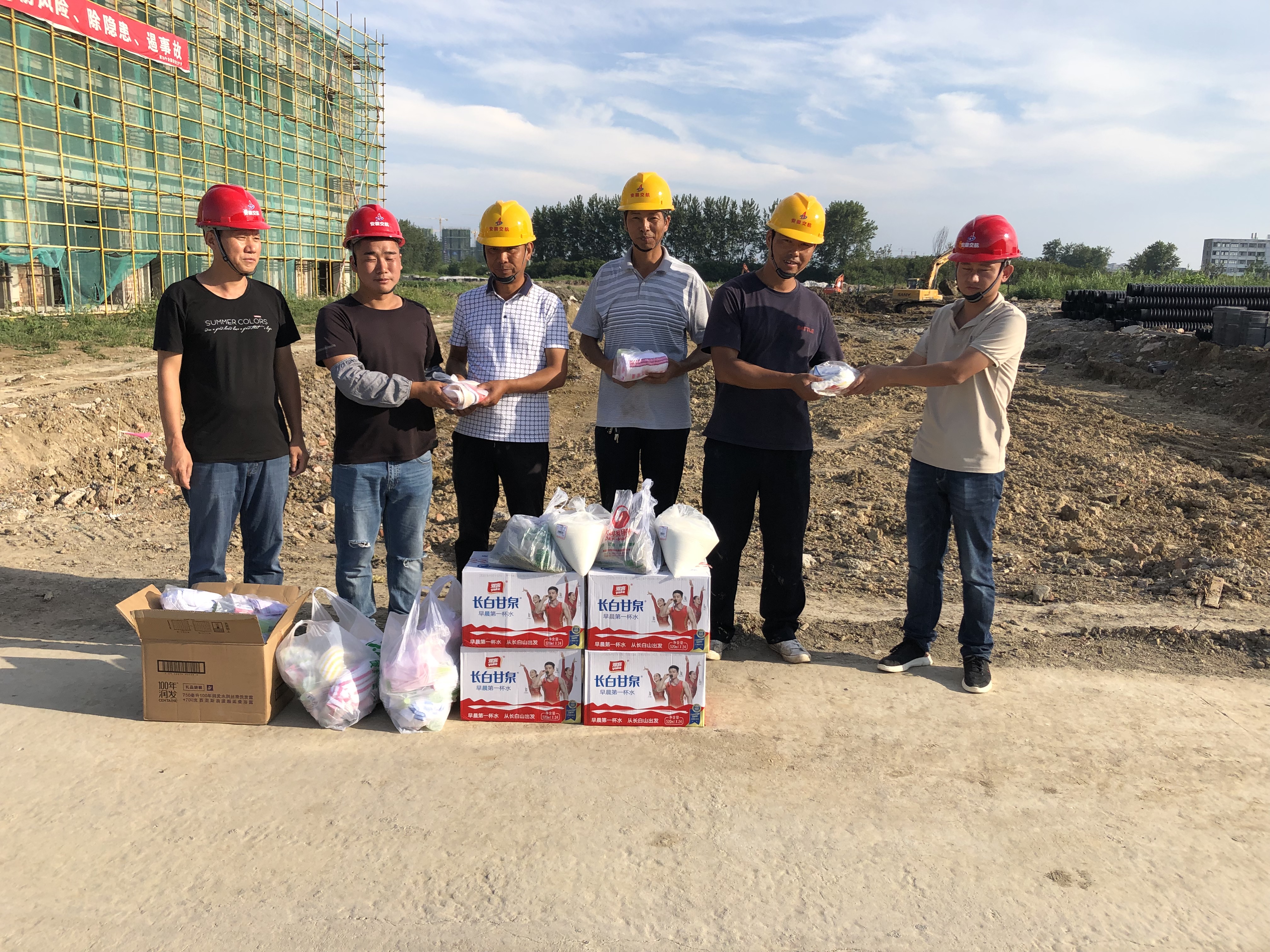 大暑雖已過去,可氣溫依舊炎熱,為了加緊工期,現(xiàn)場(chǎng)施工人員起早貪黑的在工作崗位上辛苦勞作。多金泗縣國(guó)際汽車城EPC項(xiàng)目黨支部開展了送清涼黨日活動(dòng),為奮戰(zhàn)在一線的民工兄弟們送去礦泉水、綠豆、花露水等防暑降溫物品,感謝他們?yōu)槭┕どa(chǎn)所做的努力和貢獻(xiàn)。